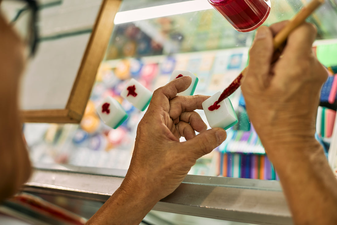 The colors of mahjong tiles primarily consist of red, blue, and green. After carving the character, Master Cheung applies a layer of talcum powder to remove any excess color beyond the boundaries. He dips a brush in “Tian Na Water” (天拿水) to soften it, and then gently applies paint to the carved mahjong tile. Only one color is applied at a time, and once it dries, another color is added. Finally, a scraper is employed to eliminate any excess paint from the surface of the mahjong tiles.